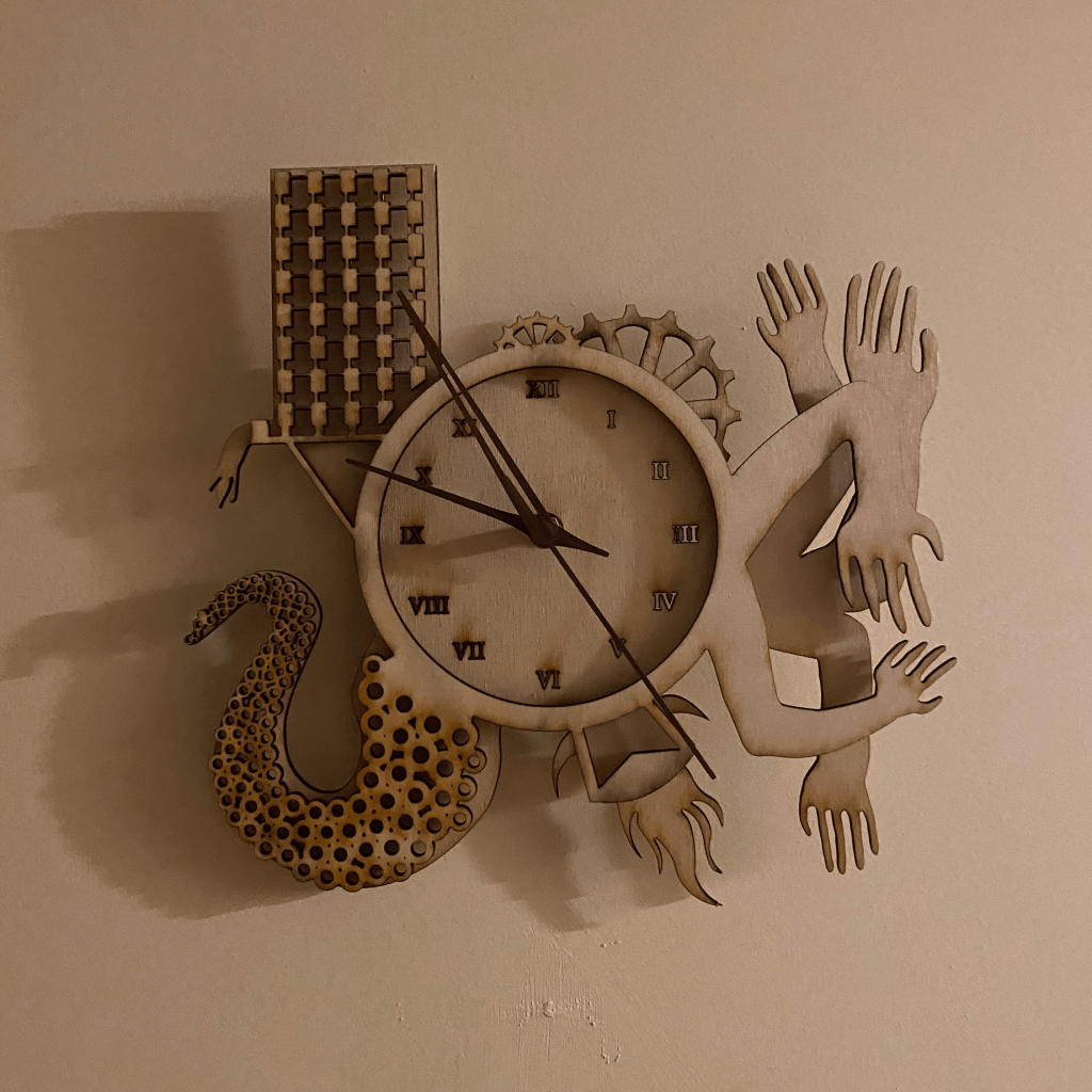 Throughout the fall of 2023, one of the doodles I kept sketching were these bizarre clocks, with hands and buildings and all sorts of random attachments. So I was very excited when my digital art class was told that we were going to not only design a clock, but that we were also going to laser cut them and assemble them as clocks.