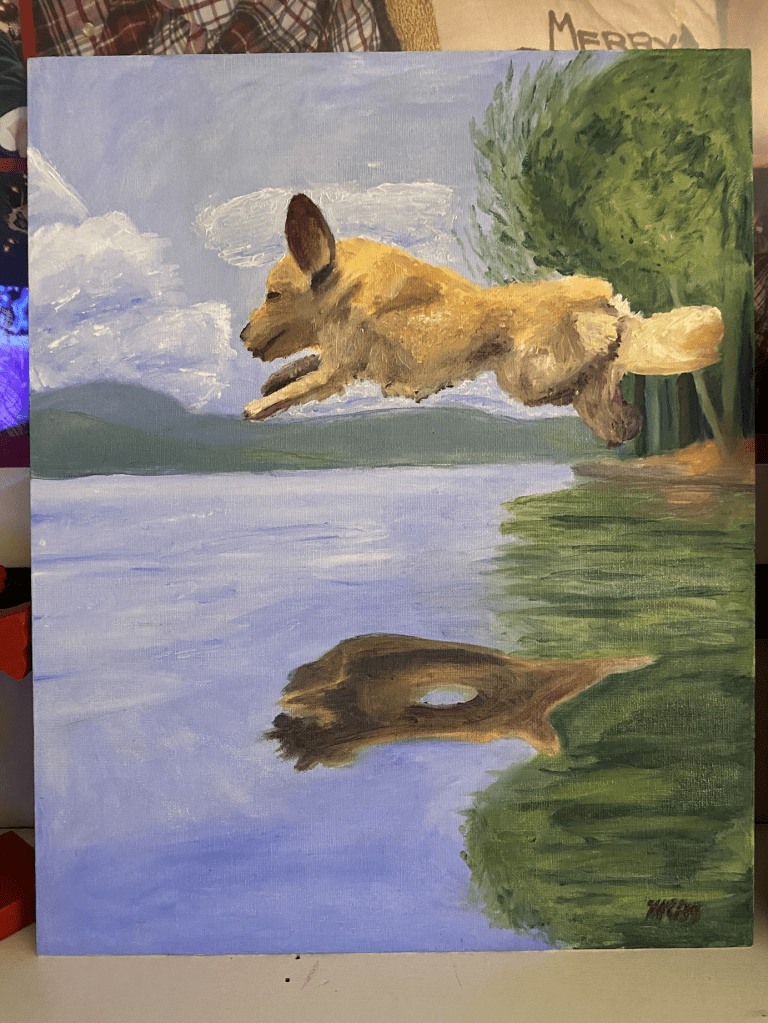 This was my Christmas gift to my parents this year, an oil painting of my dog jumping off of a dock. I am especially proud of this piece as I have been working with oils for less than a year and this is only my second piece I’ve actually dedicated time to. I am also very proud of the fact that I only used red, blue, yellow, and white paint to create this piece. (Summer – December 2024)