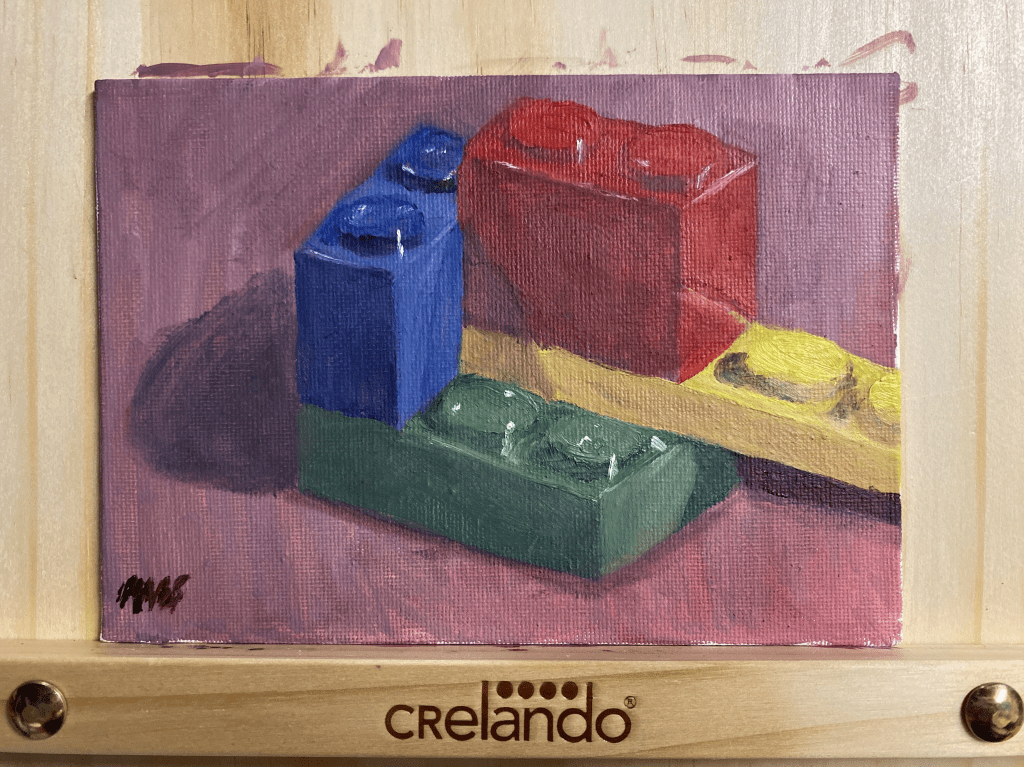 This unnamed still life of a few Lego bricks was my first venture into oil painting. I immediately fell in love with the medium, the colors blended together just how I always wished acrylics did. (January 2024)