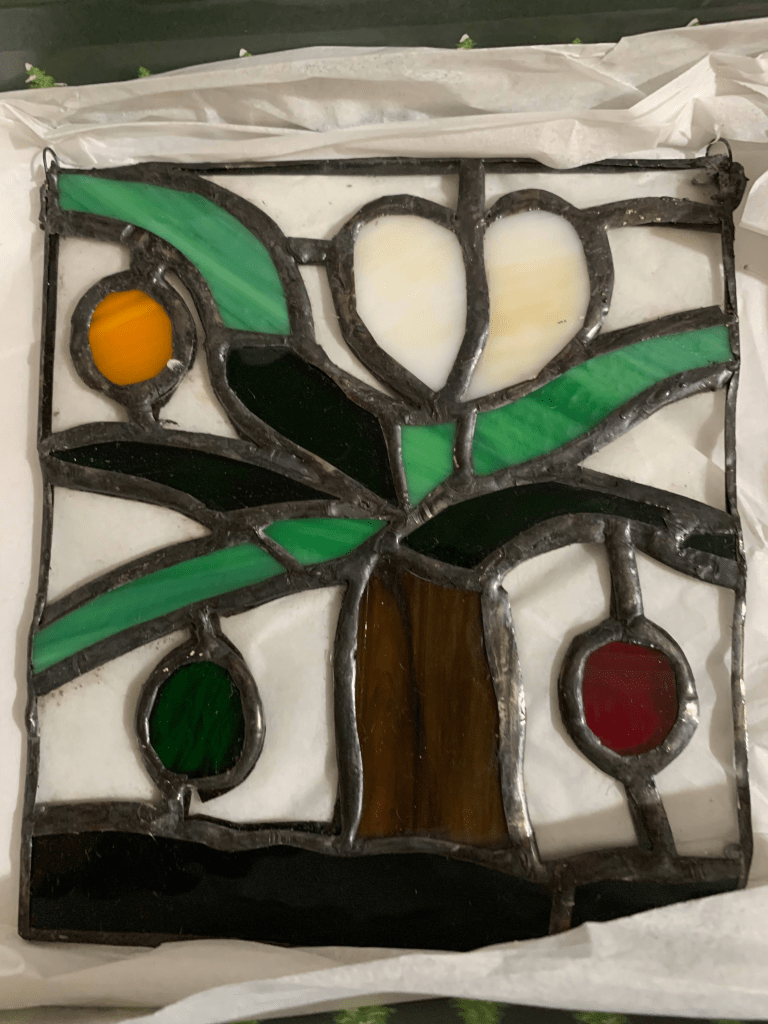 I made this stain glassed piece as a gift for my aunt. It is a recreation of her tattoo and is honestly the best gift I have given. (December 2022)