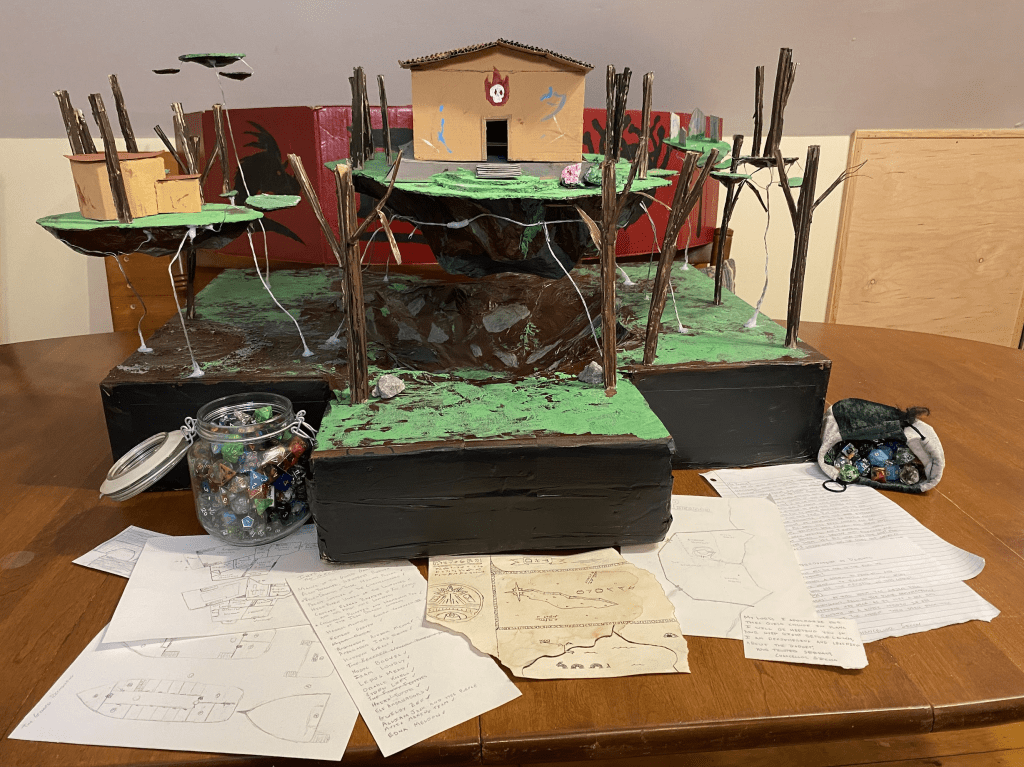 This was the set piece for the final battle of a small D&D 5e campaign I ran in the summer of 2023. I spent a few days locked in my room, listening to Welcome to Nightvale, cutting and painting and gluing furiously to get it done in time. I made it using cardboard, tissue paper, some wire, cardstock, hot glue, Mod Podge, and paint. The fight itself was dynamic and fun, and good news: the heroes won! It was a great send off for a great campaign, and some of the other props for the campaign are included in the photos below.